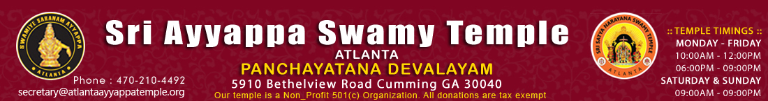 Atlanta Ayyappa Temple is situated at a very convenient location in North Metro Atlanta area. It is located at 5910 Bethelview Rd, Cumming, GA 30040, United States. and it is at the center of John Creek, Alpharetta, Cumming, Milton and Suwanee. It is a Panchayatana Devalayam. Sri Rama sahita Ayyappa is the main God at the temple. Lord Venkateswara, Lord Siva, Lord Ganesh, Lord Surya Narayana Murthy, Lord Pandu Ranga and Durga Ammavaru also will have their own temples in the main temple.